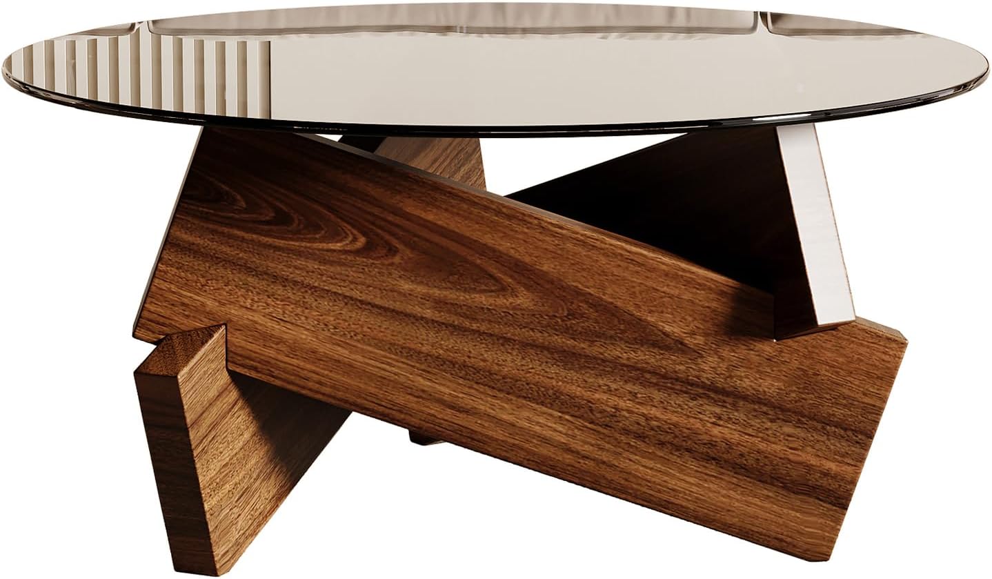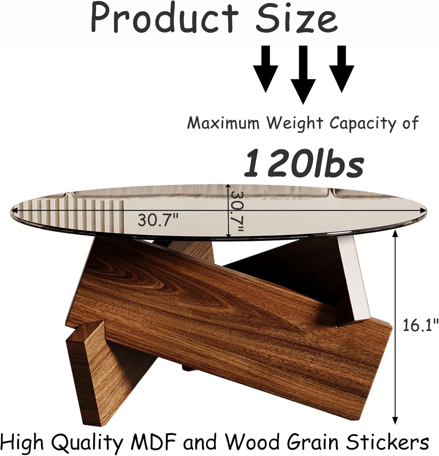 Honyee Modern Round Coffee Table, 30.7" x 30.7" x 16.1" Tempered Glass Top for Living Room, Color: Walnut