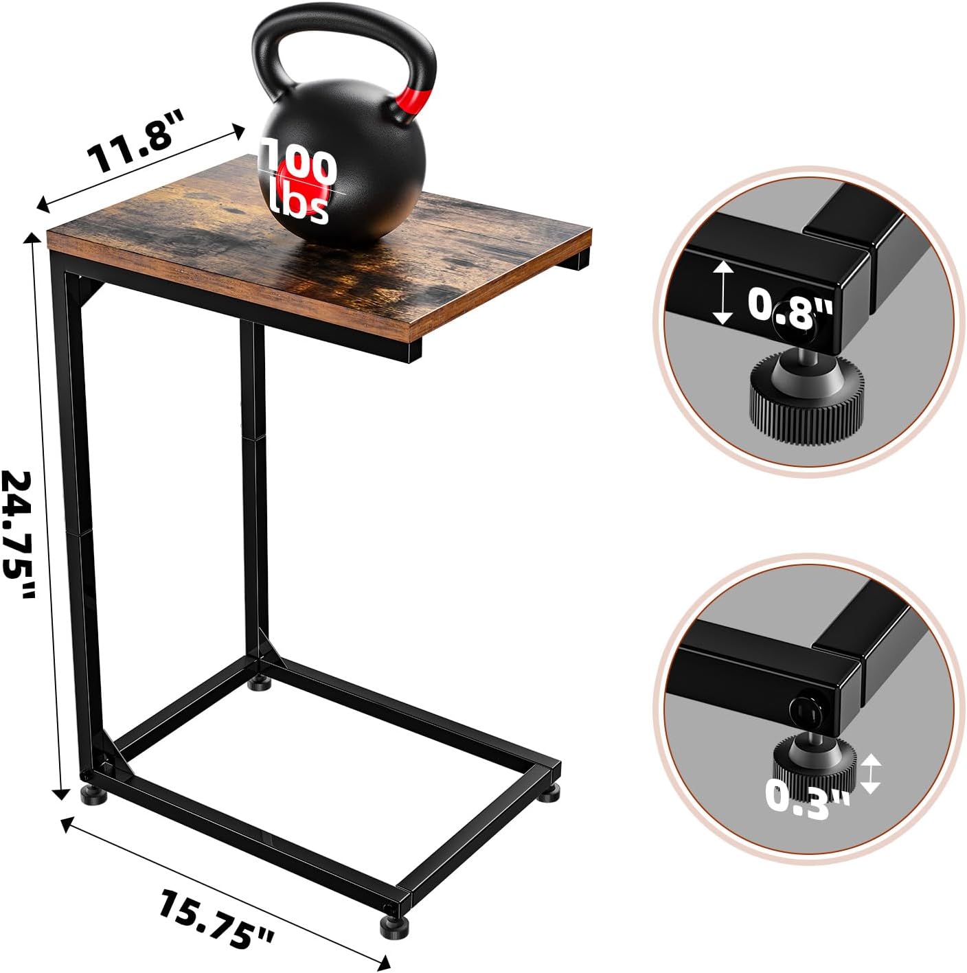 - C Shape Table: Each C-shaped table has a large table top measuring 11.8"D x 15.75"W and a reasonable 24.75" height. The C shape side table features steel legs so it's easy to move when eating or working on the sofa or beside the bed.