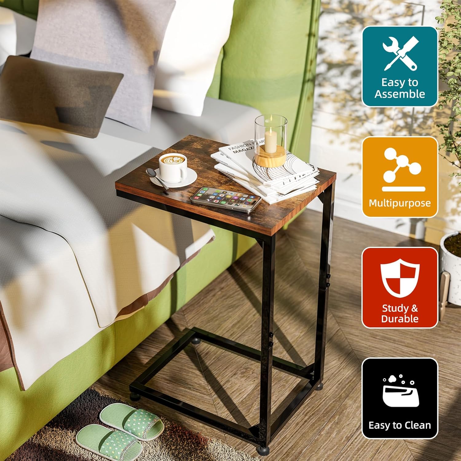 - Variety of Uses: This side table can be used as an end table, couch table or bedside table in your living room or bedroom.This slim side table easily fits the gaps between your couches or the tight spots beside your bed.