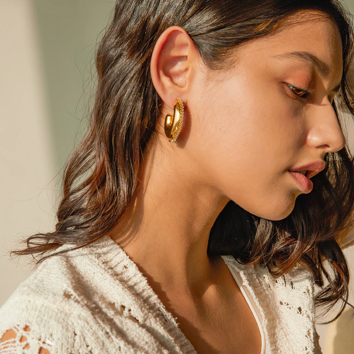 Добавьте блеска вашему образу с этими легкими и уютными серьгами из нержавеющей стали с позолотой 18 карат в уникальной форме буквы C. Созданные для женщин, которые любят сочетать модность с элегантностью, эти серьги — идеальный аксессуар для любого случая — от гала-событий до повседневной носки.