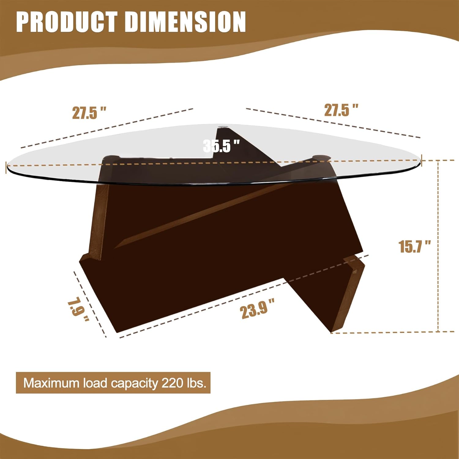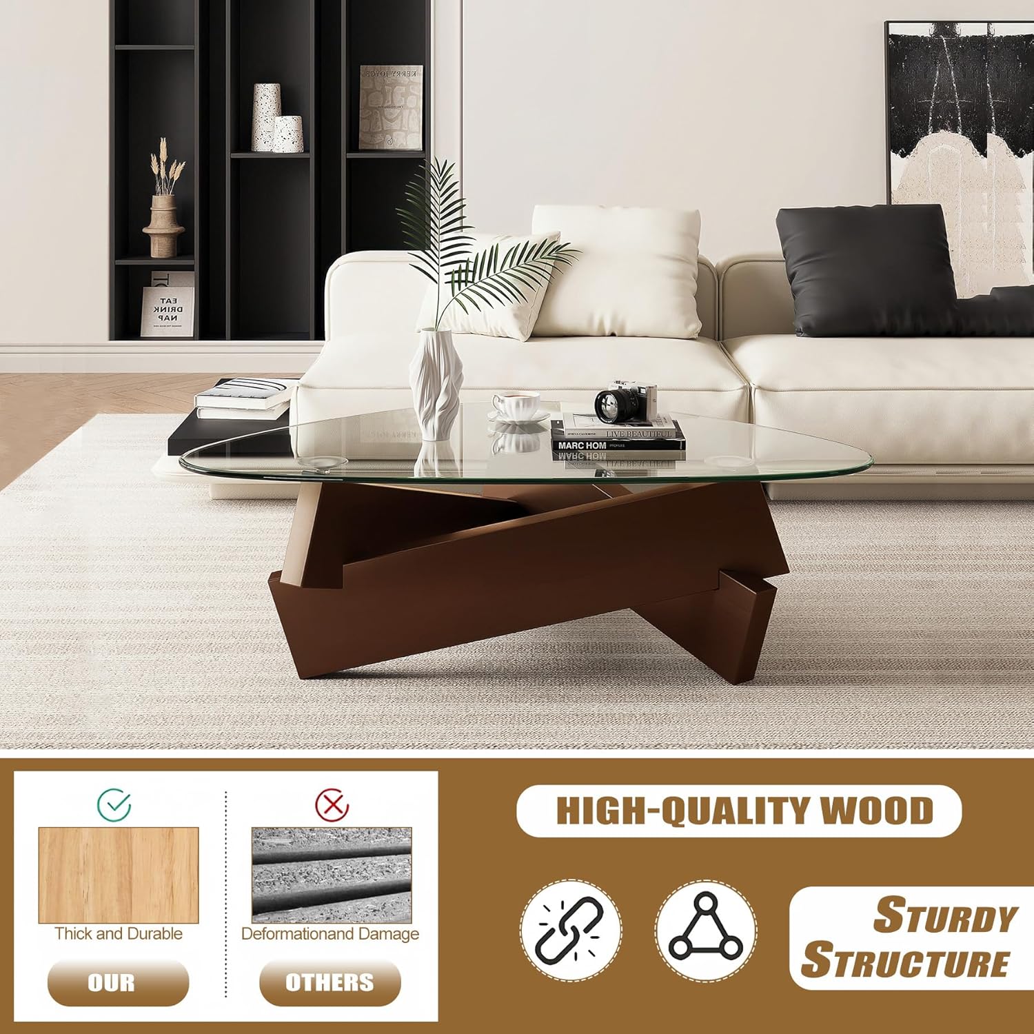 Walnut Triangle Coffee Table 35.5'' x 27.5'' x 15.7'' Modern Mid Century Glass Coffee Table Rustic Brown Solid Wood Center Table Funky Retro Vintage Tea Table for Living Room & Small Space