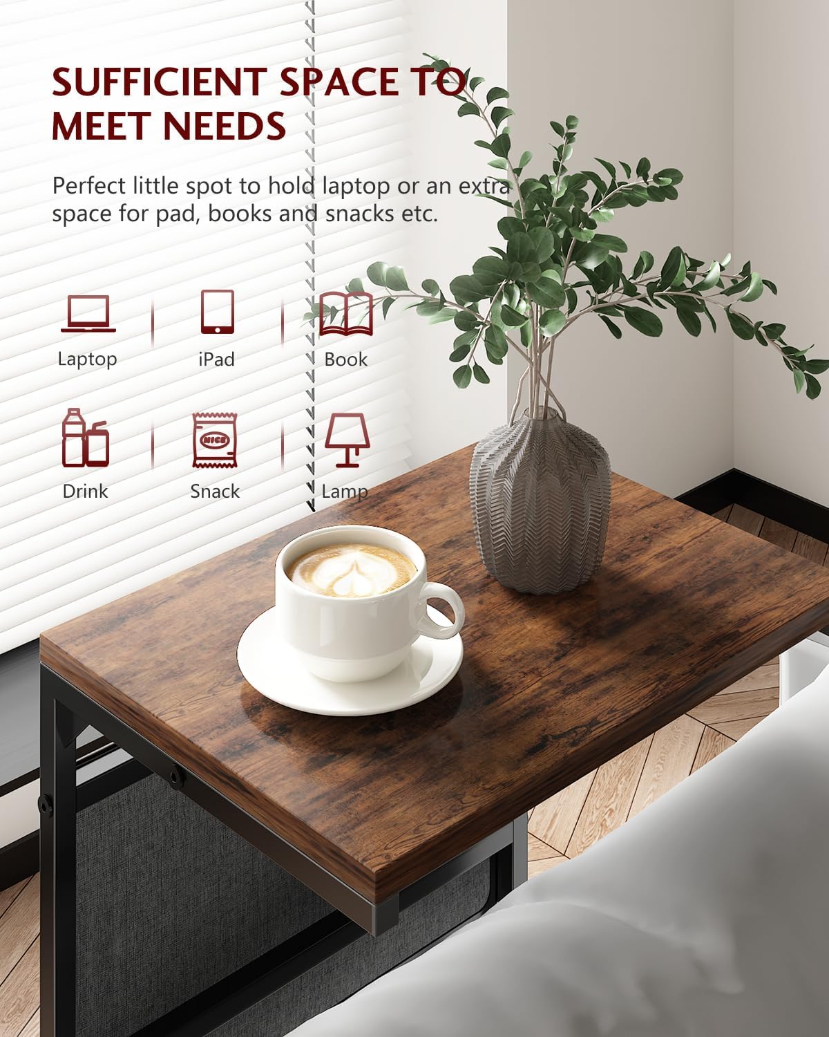 - 【Convenient Structure】The c shaped design allows you to slide this small couch tables under a chair, sofa and recliner, offer you convenient access to your laptop for home office; Ideal for adding an extra table lamp, eating a meal while watching TV