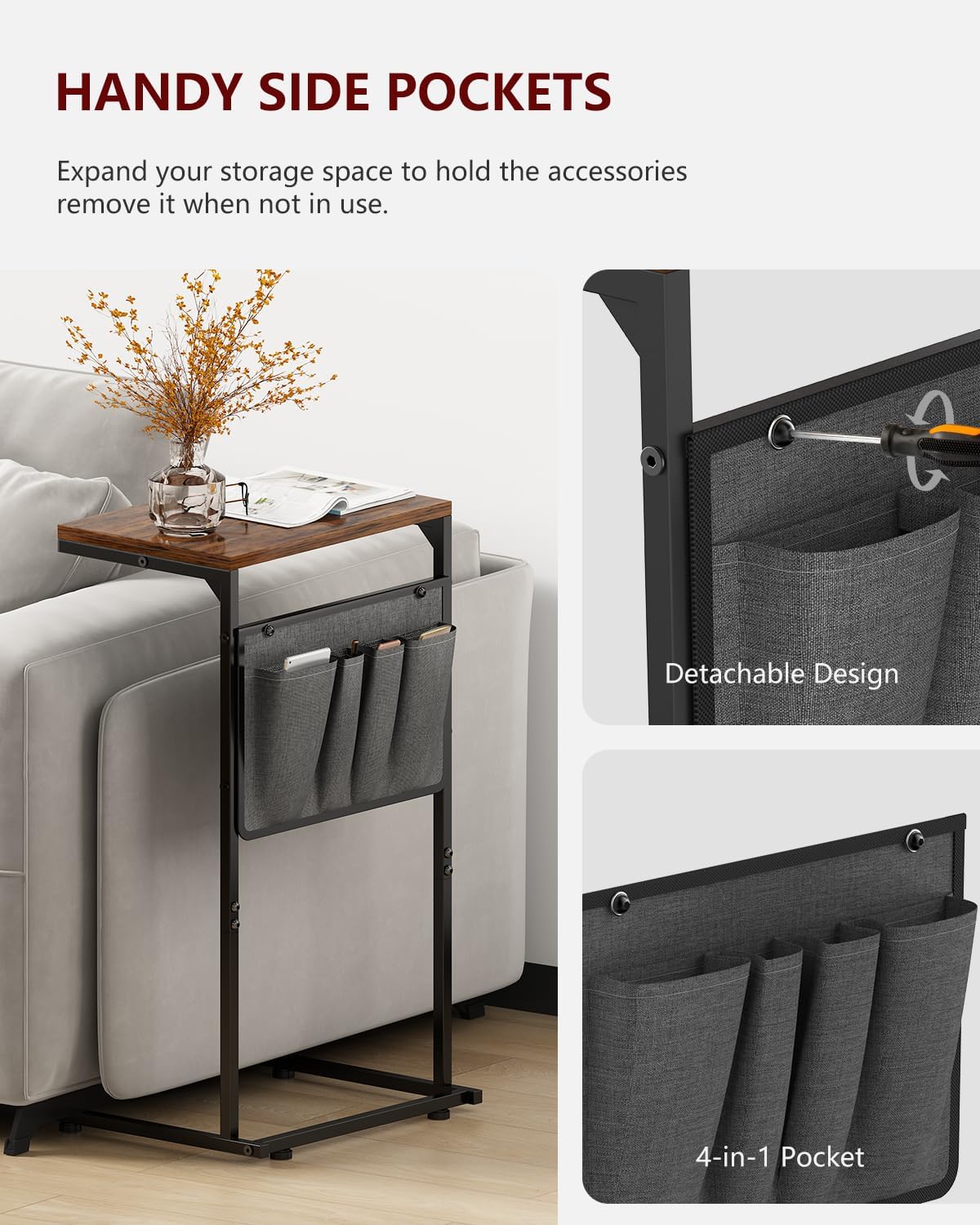 - 【Fit Small Spaces】Sized at 16”L x 11.6”W x 28”H, easily fits the gaps between your couches or the tight spots; For homes without more space for nightstands and sofa side table, this recliner side table with storage pocket is certainly the excellent choice