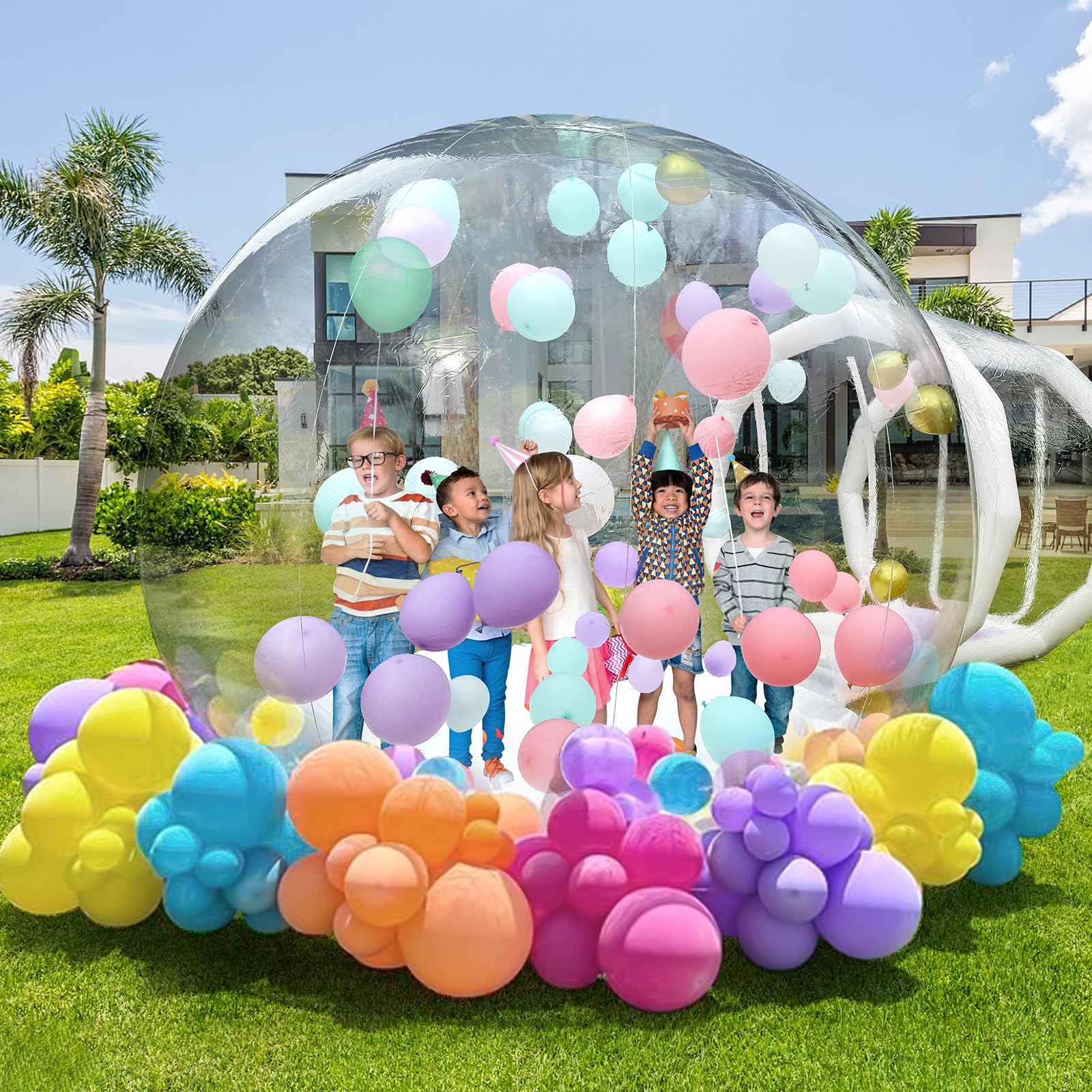 - 【Giant 10FT Indoor/Outdoor Play Space】 This inflatable bubble house offers a spacious 10FT diameter dome, providing ample room for 3-5 kids to play, crawl, and explore! Perfect for backyard parties, indoor playrooms, or camping adventures.
