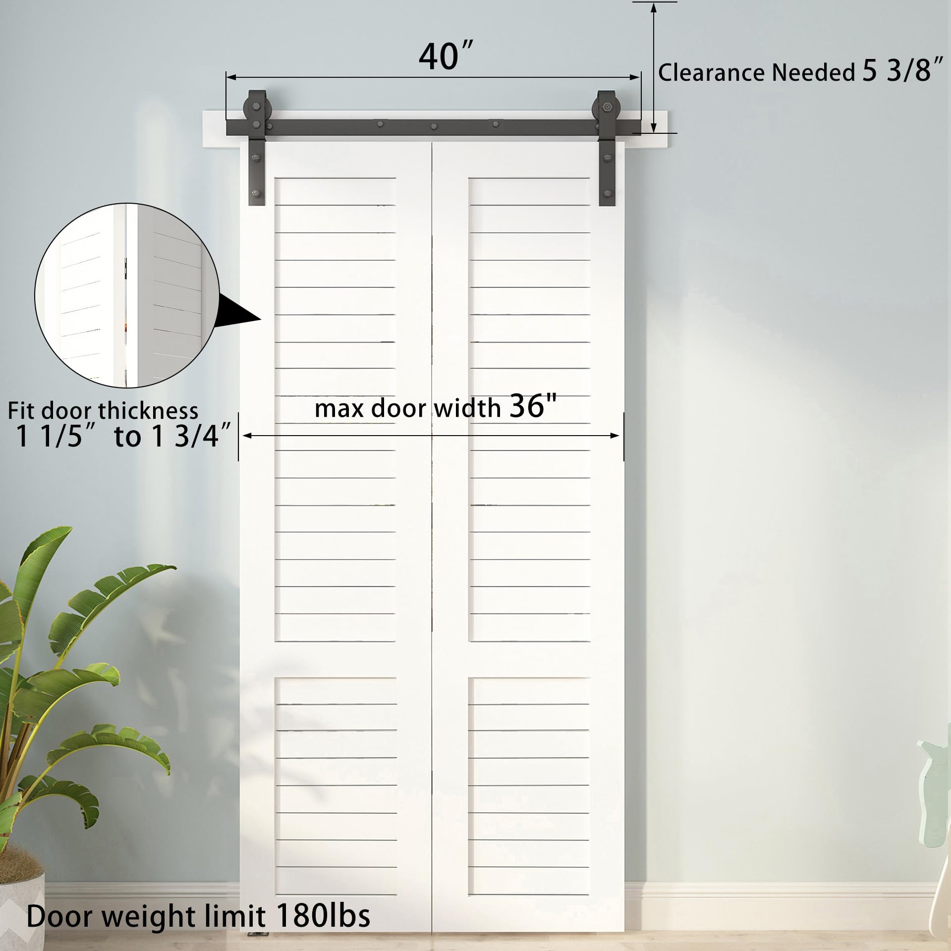 - PRODUCT DIMENSIONS: Track length: 40". The track length should be door opening size + 4" (100mm), at least 5 3/8" clearance needed from top of door to ceiling, fit max door panel width 18", fit door thickness: 1 1/5"~1-3/4". Door weight capacity: 180lbs.