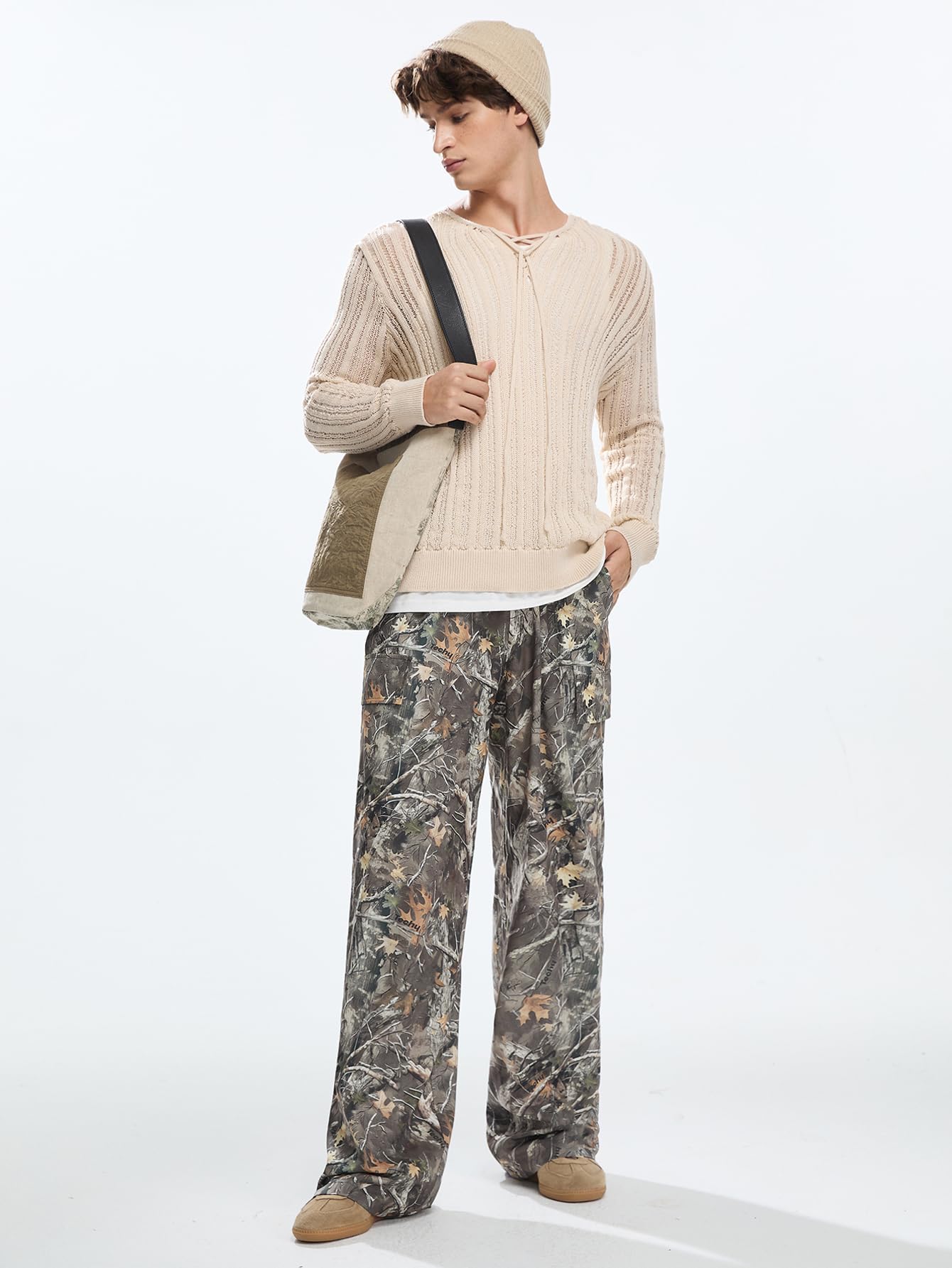 - Camouflage and letter print, patchwork, color block, flare leg, drawstring waist, fashion sweat pants for men